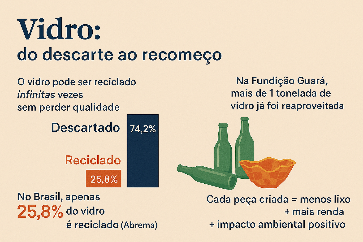 Segundo a Associação Brasileira de Distribuidores e Processadores de Vidros Planos (Abravidro), o vidro é um dos materiais mais sustentáveis do planeta: pode ser reciclado infinitas vezes sem perder qualidade. Apesar disso, o Brasil recicla apenas 25,8% do que produz, conforme dados da Associação Brasileira de Resíduos e Meio Ambiente (Abrema). O restante se acumula em aterros, lixões e, muitas vezes, acaba nas praias e manguezais.