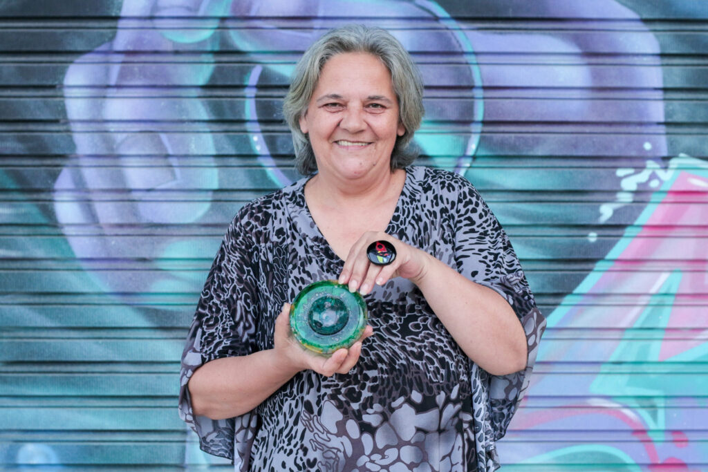Guia de turismo e empreendedora, Angélica conheceu a Fundição em 2023, quando ainda trabalhava em feiras no calçadão de Matinhos. “Quando soube que o vidro seria reaproveitado, quis participar. O Litoral não tinha destino certo para esse material, e agora ele vira arte e renda”.