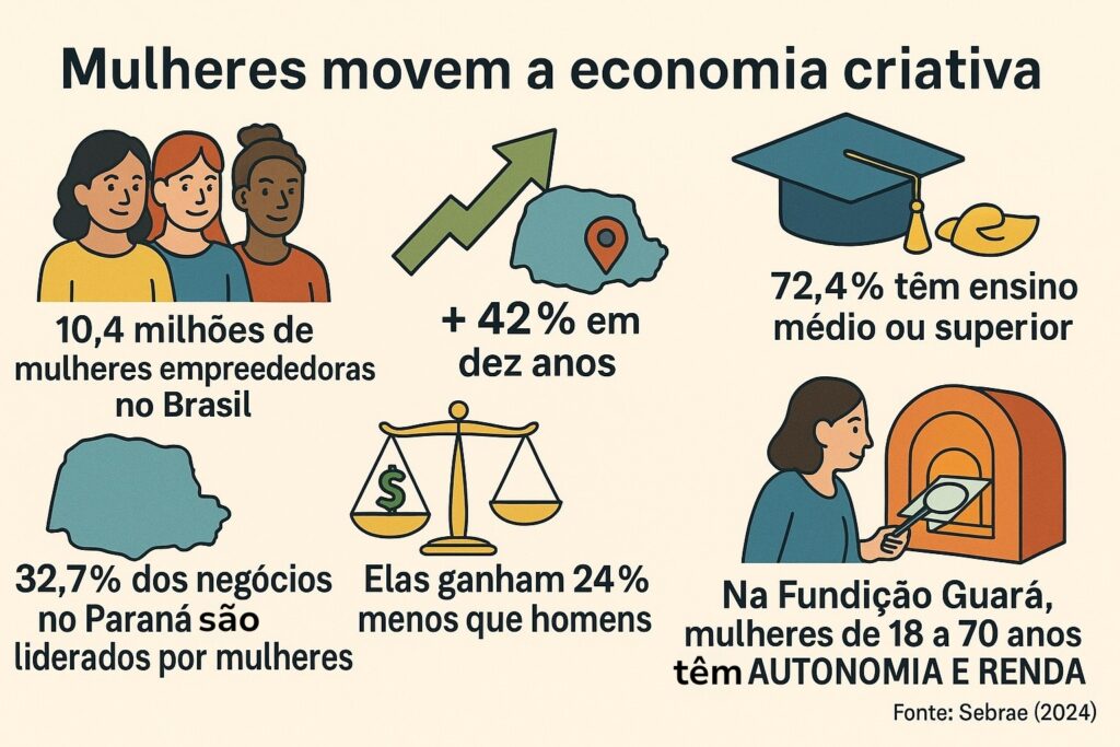 De acordo com o Serviço Brasileiro de Apoio às Micro e Pequenas Empresas (Sebrae), o Brasil conta hoje com 10,4 milhões de mulheres empreendedoras – um aumento de 42% em relação a 2012. No Paraná, 32,7% dos negócios são liderados por mulheres, e mais da metade delas são chefes de família. As empreendedoras também se destacam pelo nível de escolaridade: 72,4% têm ensino médio completo ou mais, e quase 29% possuem ensino superior. Mesmo assim, continuam recebendo, em média, 24% menos que os homens.