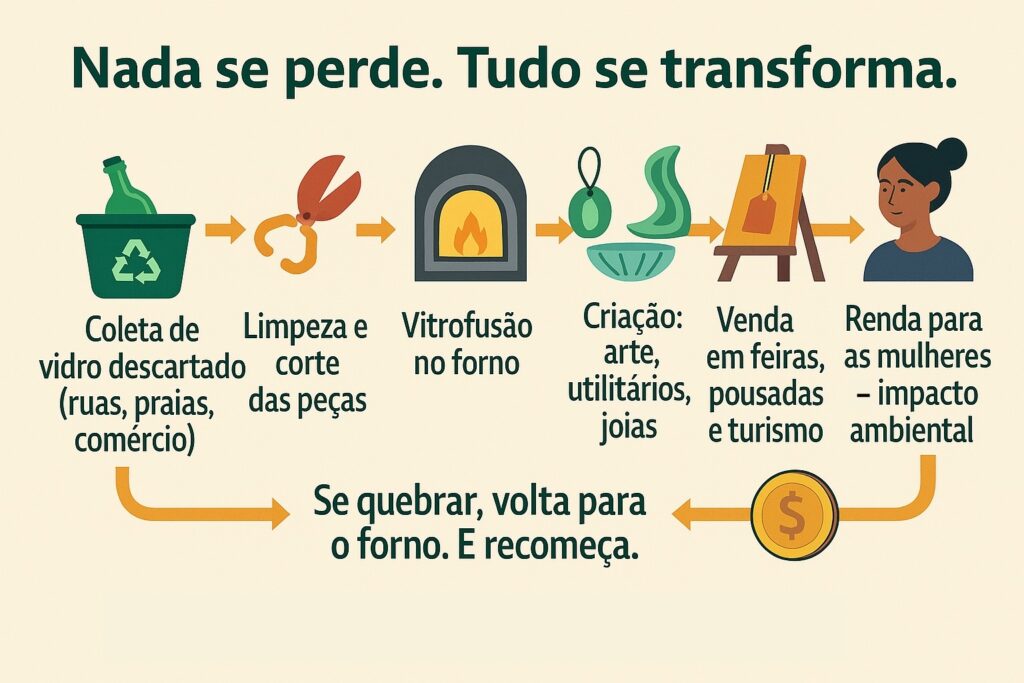 Hoje, ela vê a iniciativa como aliada do turismo sustentável. “Quando levo turistas pela orla, falo que aquele vidro jogado pode se transformar em uma peça de arte. Isso muda a forma como as pessoas veem o nosso território. É geração de renda, educação e pertencimento”, destaca.