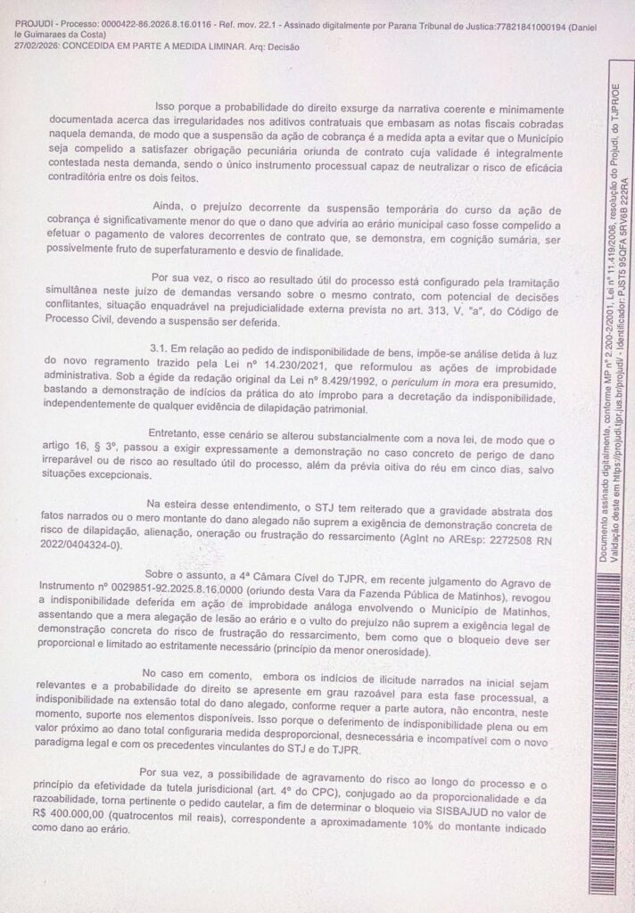 A juíza também suspendeu uma ação de cobrança de R$ 544,9 mil movida pela empresa Iris BS System Ltda. contra o município. A firma pleiteava pagamentos relativos ao primeiro trimestre de 2025, mas, para a magistrada, os indícios de superfaturamento e desvio de finalidade justificam a suspensão dos repasses até o fim do processo.