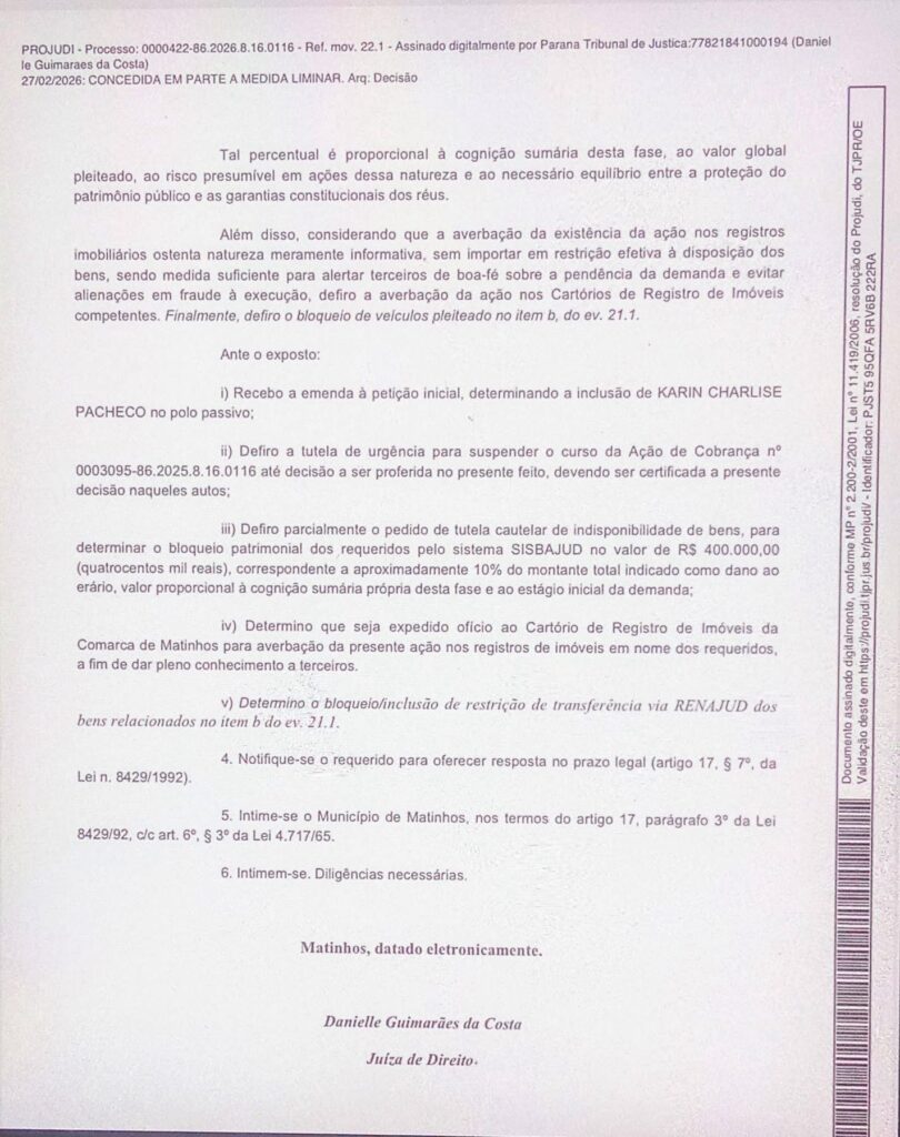 A decisão liminar, proferida pela juíza Danielle Guimarães da Costa, da Vara da Fazenda Pública de Matinhos, atinge os réus Aldemir Zwetsch Junior, ex-secretário de segurança da cidade e filho do ex-prefeito, Elenice Fatima Lorencena, Jose Carlos do Espírito Santo ex-prefeito de Matinhos, Ronald Felipe Wolochn e a empresa Ronald Felipe Wolochn Eireli.